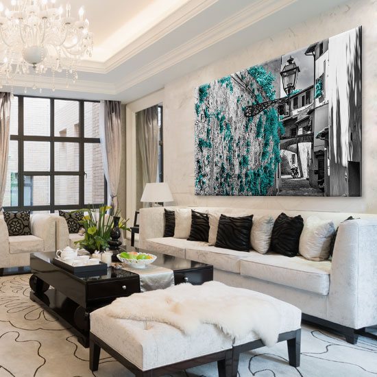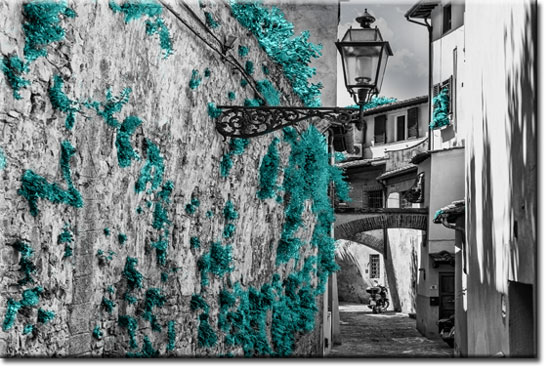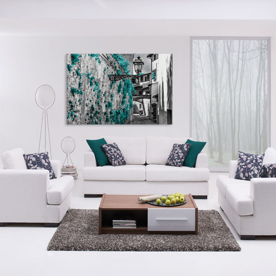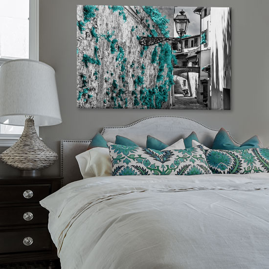 Nowoczesny obraz z motywem malowniczego greckiego zaułka z roślinami i stylową lampą na murze. Dekoracja czarno–biała z dodatkiem koloru turkusowego. Obraz polecamy do wystroju salonu lub sypialni.