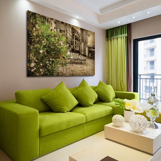 Efektowny obraz przedstawiający uliczkę i kawiarenkę.  Ozdoba w kolorze sepii z zielonymi elementami. Dekorację polecamy do ozdoby salonu lub biura.